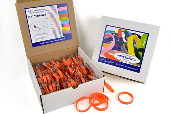 No One Fights Alone®! Our most popular wristband is packaged and ready for fundraising! This box of 50 wristbands has a pre-made selling guide adhered to the inside lid.