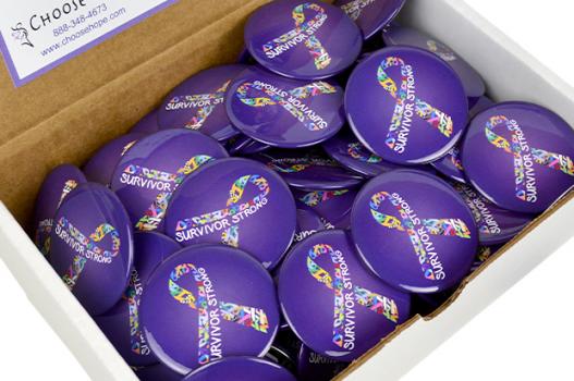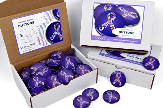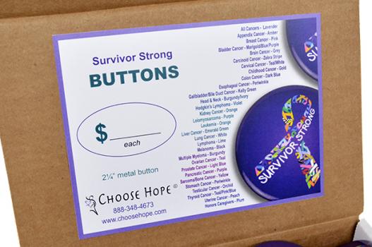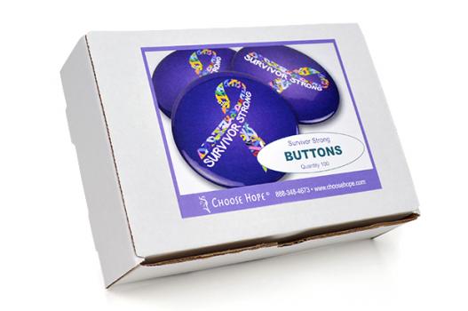 Bulk box of 100 of our Survivor Strong buttons. You are a survivor from the minute you hear the words, “You have cancer.” Whether it’s about surviving the diagnosis or surviving the cancer journey, our Survivor Strong button will give you and your loved ones the strength and courage to move forward!