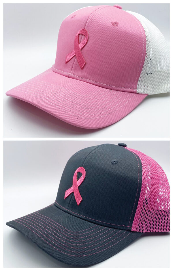 These hats are decorated with a Pink Breast Cancer Awareness Ribbon Patch on the front of the hat!