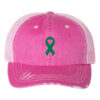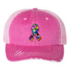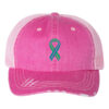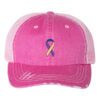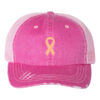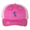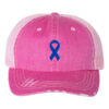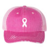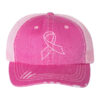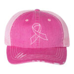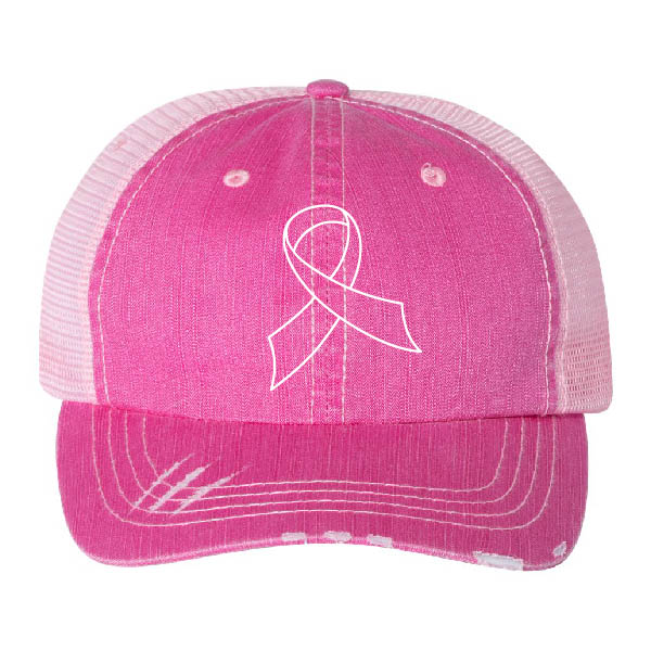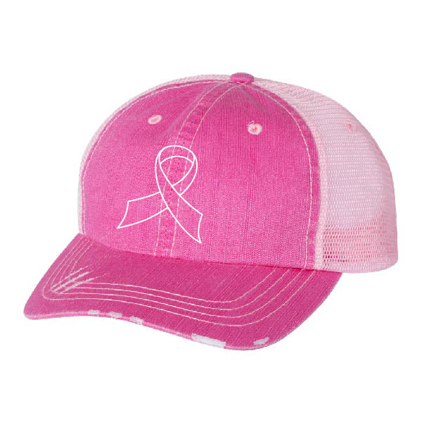 Wearing pink can support any type of cancer with our sassy distressed pink trucker cap with a ribbon color of your choice on the front! For Breast Cancer we decorate with a ribbon outline, all other cancer types decorated with an embroidered patch.