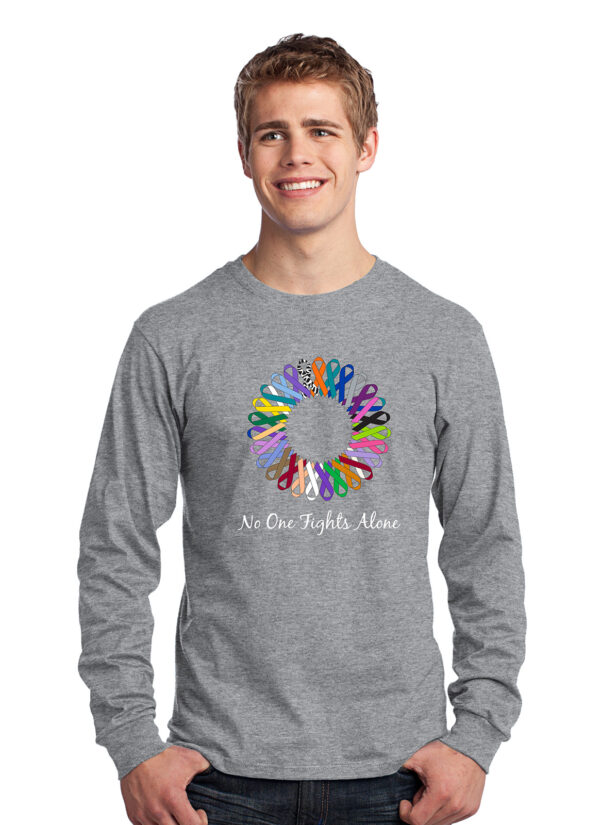 Designed by our own survivors, each shirt features an array of all cancer ribbons joined together in unity. Our trademarked phrase No One Fights Alone® completes the look, making this long sleeve t-shirt is a great option for comfortability while spreading awareness for ALL cancers!