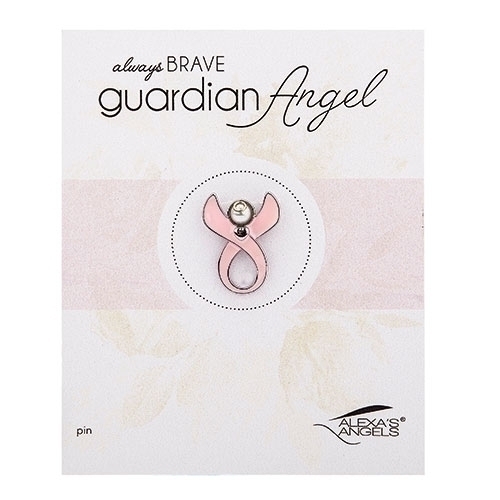 Believe for a cure. This Angel pin coordinates with our Always by my Side Bedside Angel, crafted of Rhodium/18K Gold Plate, Enamel and Faux Pearls, this sweet pin is dainty and delivers a message. Measures .75″h with tie tac style pin back.