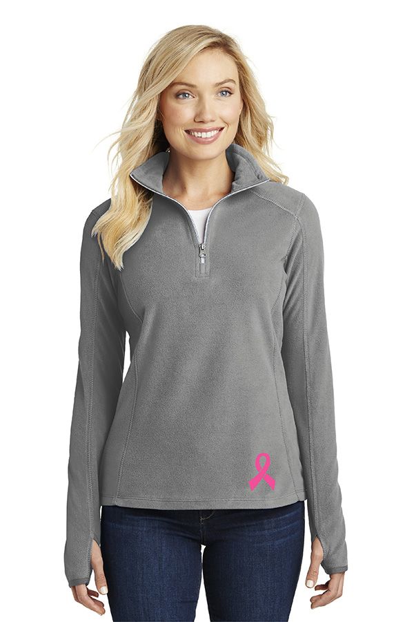 For exercise or errands, this pullover is warm enough to keep the cold at bay, yet soft, lightweight and non-bulky. Featuring a pink ribbon embroidered on the left hip.