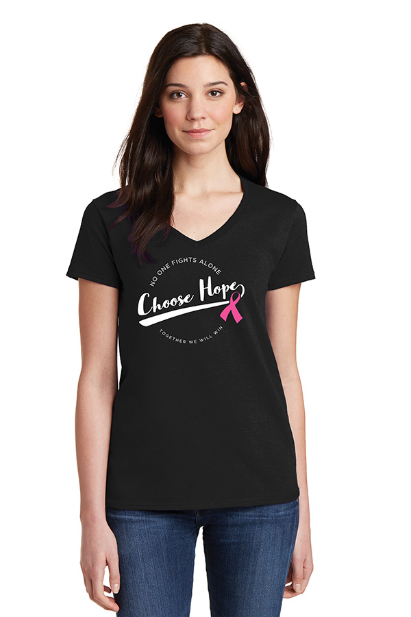 This inspirational shirt delivers not one, not two but three messages in one! Featuring trademarked slogans No One Fights Alone® and Together We Will Win® surrounding the sentiment that we all must Choose Hope! Printed on a Ladies V-neck short sleeve T-shirt.