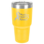 This tumbler is laser engraved with the No One Fights Alone® slogan and Cancer Awareness Ribbon as shown in the product images.