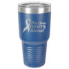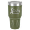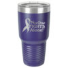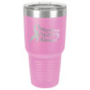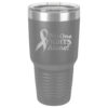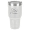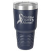 This tumbler is laser engraved with the No One Fights Alone® slogan and Cancer Awareness Ribbon as shown in the product images.