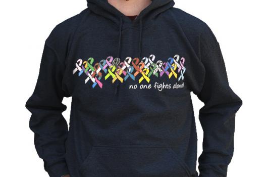 Our popular trademarked phrase “No One Fights Alone®” is paired with a contemporary design showcasing all the cancer awareness ribbons! Colorful and supportive, this No One Fights Alone® Multicolored Ribbon Hooded Sweatshirt is ideal for staying warm and cozy on cool days.
