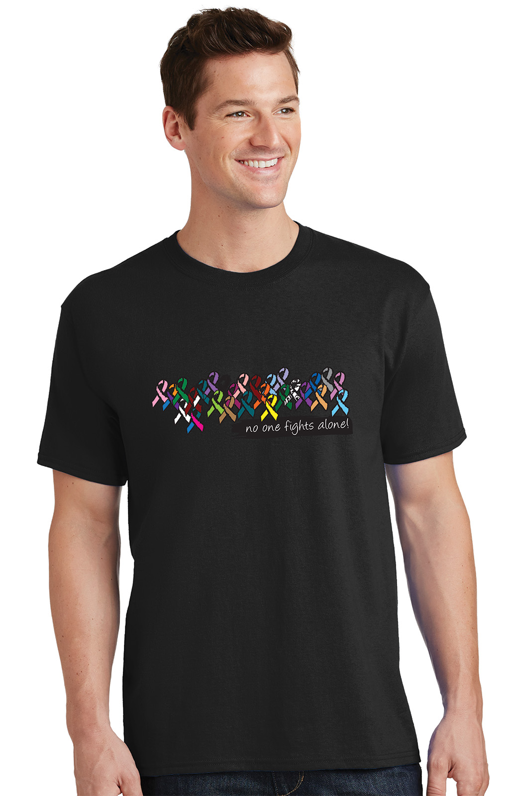 Colorful and supportive, this preshrunk No One Fights Alone® Multicolored Ribbon T-shirt is comfortable and represents every person impacted by cancer, regardless of what type.
