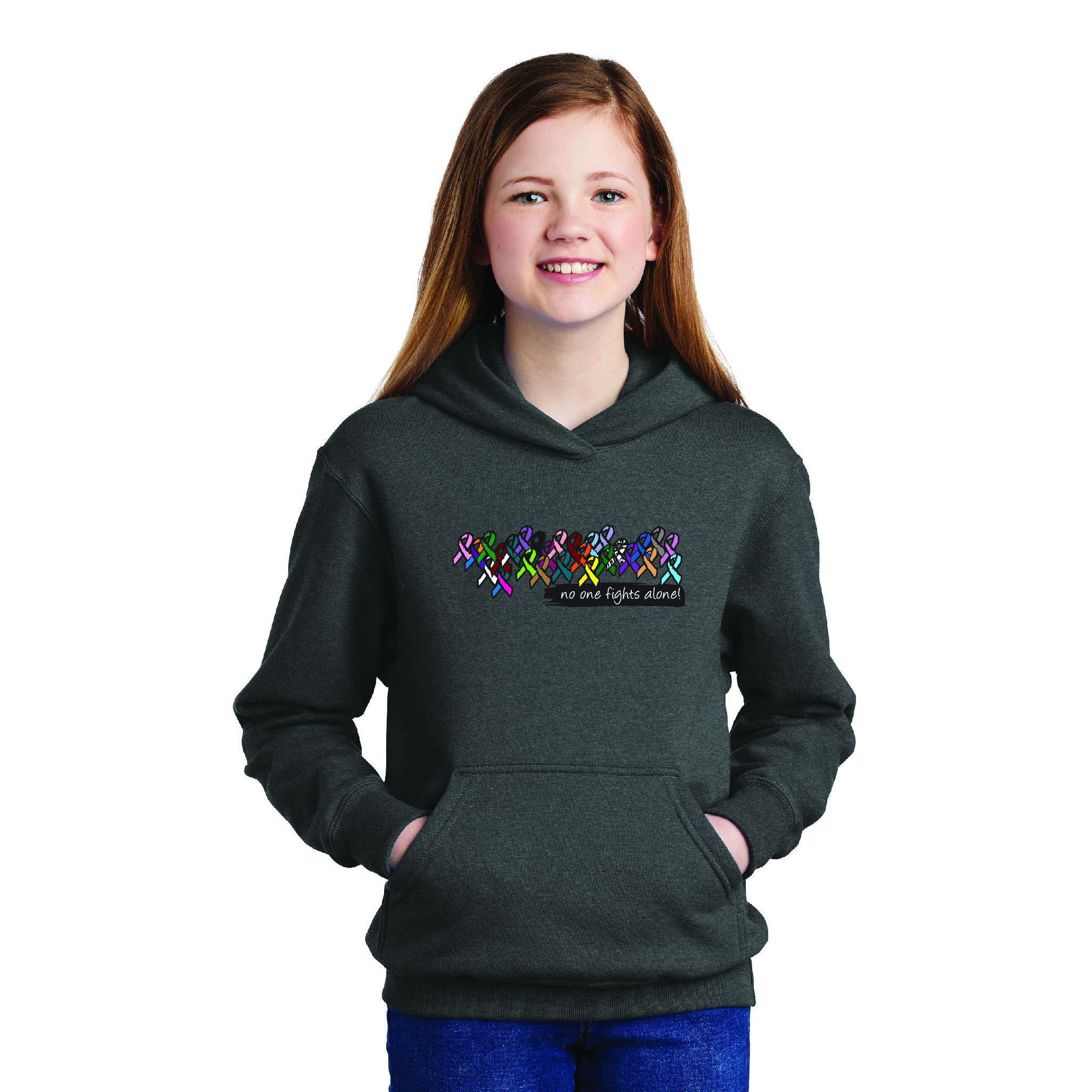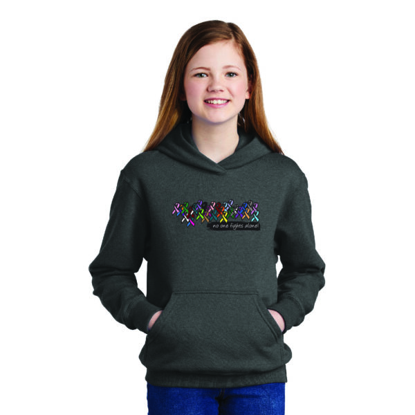 Our popular trademarked phrase “No One Fights Alone®” is paired with a contemporary design showcasing all the cancer awareness ribbons! Colorful and supportive, this No One Fights Alone® Multicolored Ribbon Youth Hooded Sweatshirt is ideal for staying warm and cozy on cool days. Pair it with our unisex option to outfit the whole family!