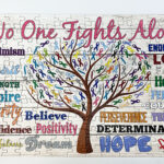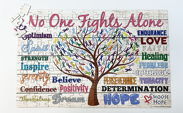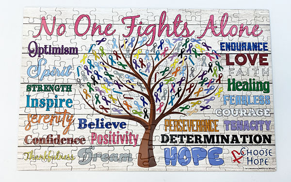 Looking to pass the time during a chemo treatment or while staying at home with the family? Our No One Fights Alone® puzzle features a tree of life with all the ribbon colors represented surrounded by inspirational words to keep you going!