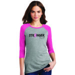 We’ve taken our popular stronger than you think graphic and placed it on our ladies cut 3/4 sleeve raglan shirt with a grey body and pink sleeves for a new feminine look!