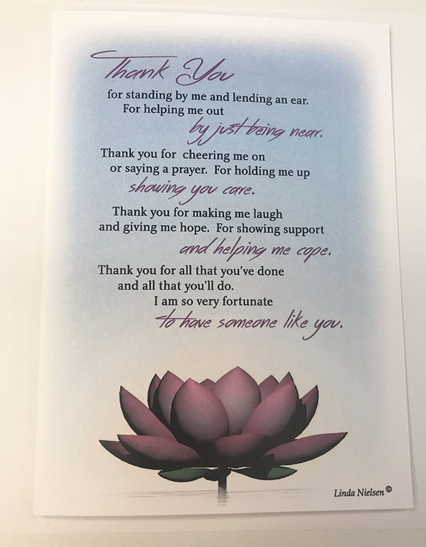 Do you need to express your appreciation for a special caregiver in your life? Our caregiver greeting card features a lotus flower and a soothing background for a beautiful poem written by our own Linda Nielsen on the cover and is blank inside for you to add your personal message.